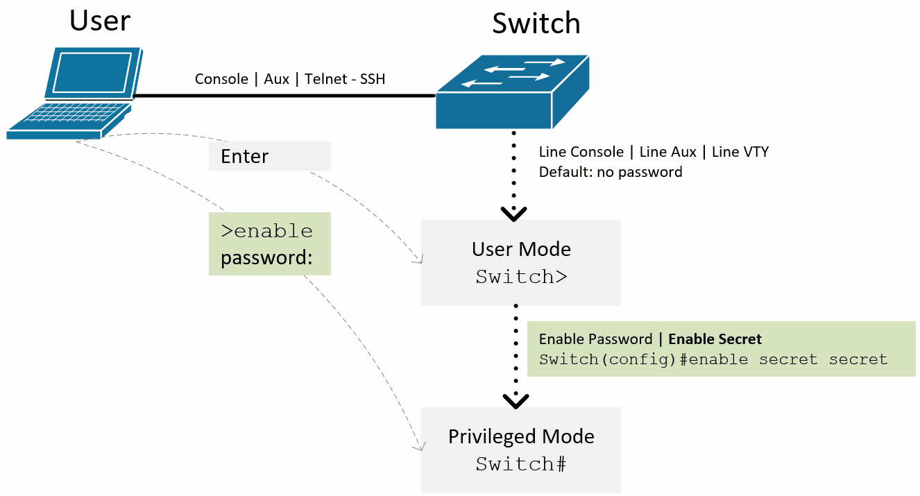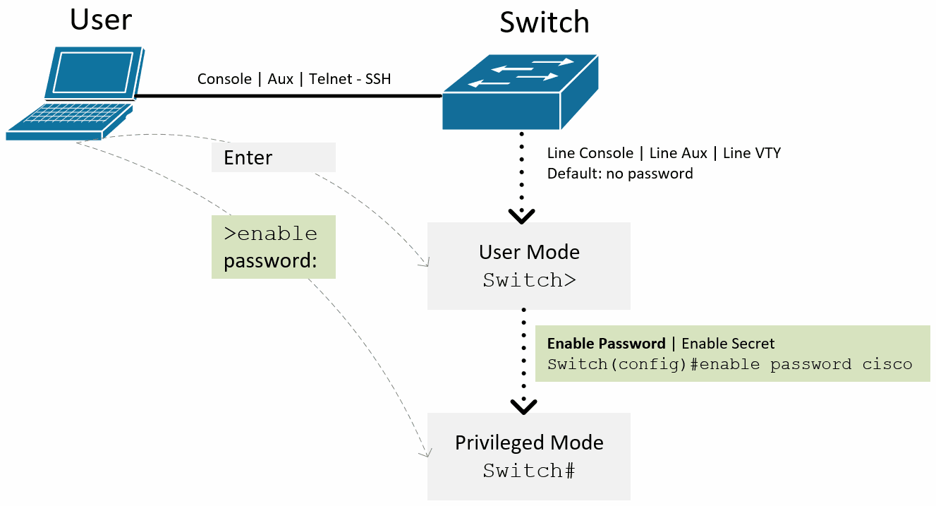 Saat pertama kali mengakses router/switch, kamu bisa langsung ke user mode (Switch>). Tanpa perlu autentikasi terlebih dahulu, tinggal tekan enter. Begitu juga saat ingin masuk ke privileged mode (Switch#). Tidak ada password secara default.