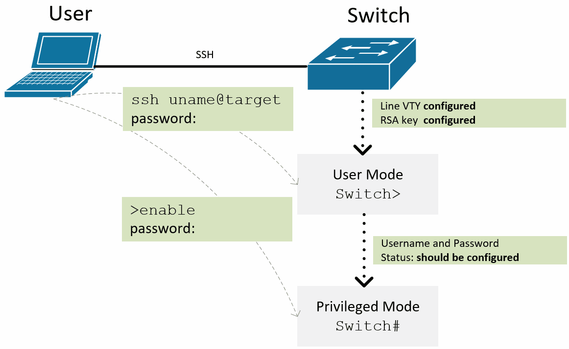 User akan diminta menginputkan password saat ingin masuk ke privileged mode, jika gagal (defaultnya 3x) maka mode akan kembali ke user mode.