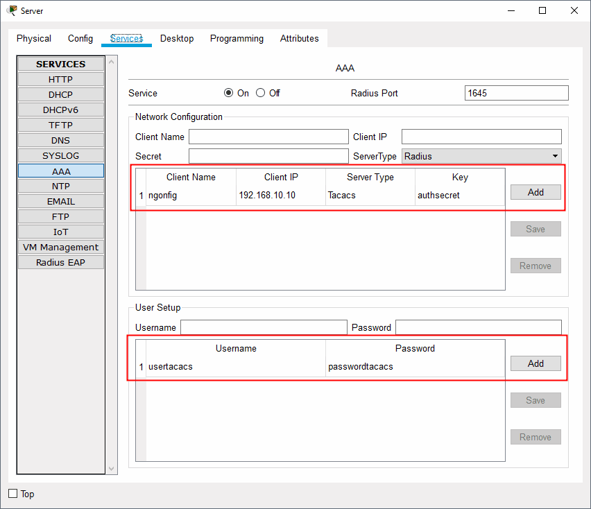 Ada 2 yang perlu kamu konfigurasi AAA server. Pertama untuk mendaftarkan client (siapa yang akan mengakses server ini), jenis servernya adalah tacacs, dan tentukan key (password)nya.