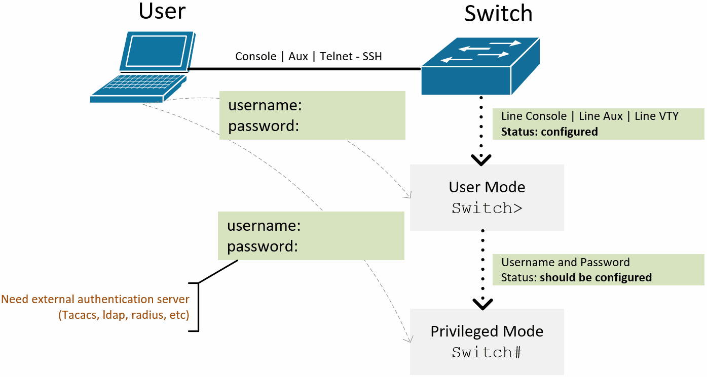 - Sedangkan tiga lainnya diminta saat kamu ingin mengakses router/switch dari port console, auxilary, atau remote melalui telnet/ssh (line vty).