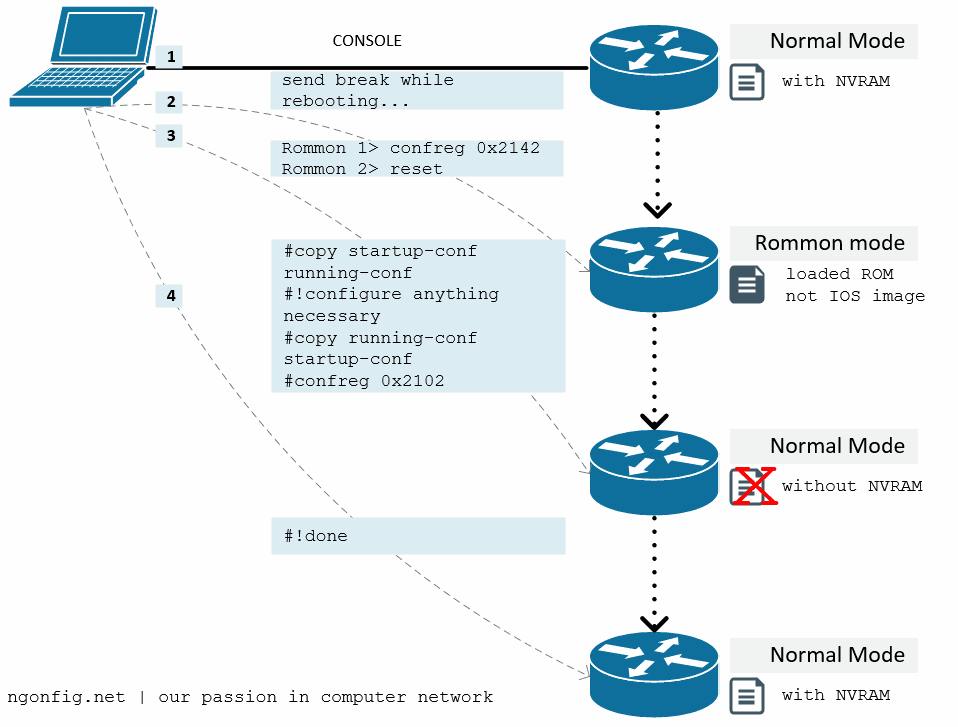 Rommon 1 >, ganti configuration register menjadi0x2142 Rommon 2 >reset, untuk reload router- Router akan start dengan ‘nvram bypassed’, “no” untuk setup mode